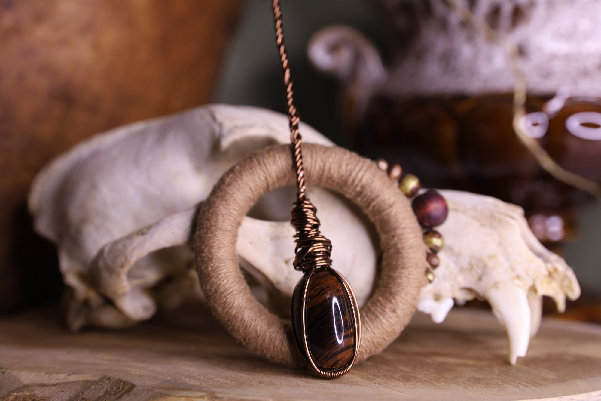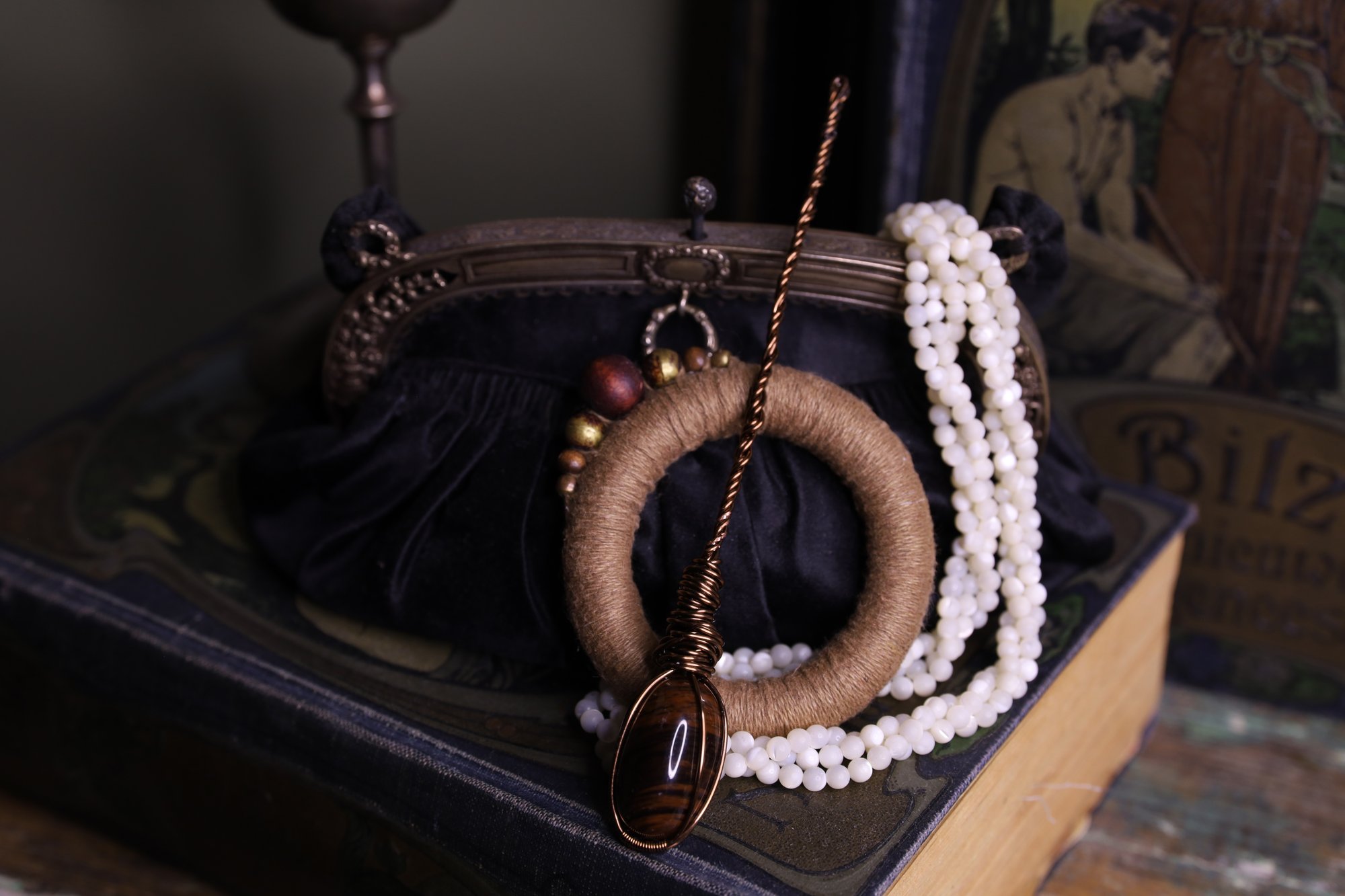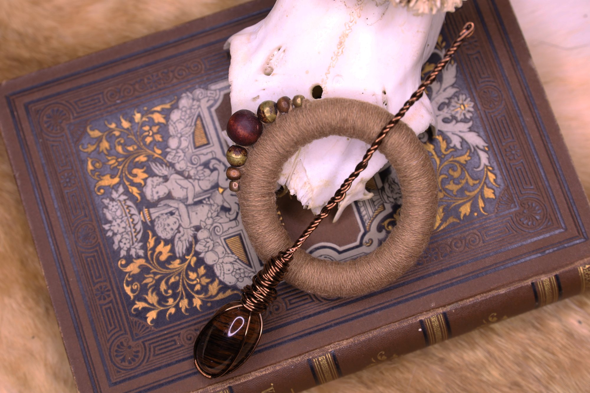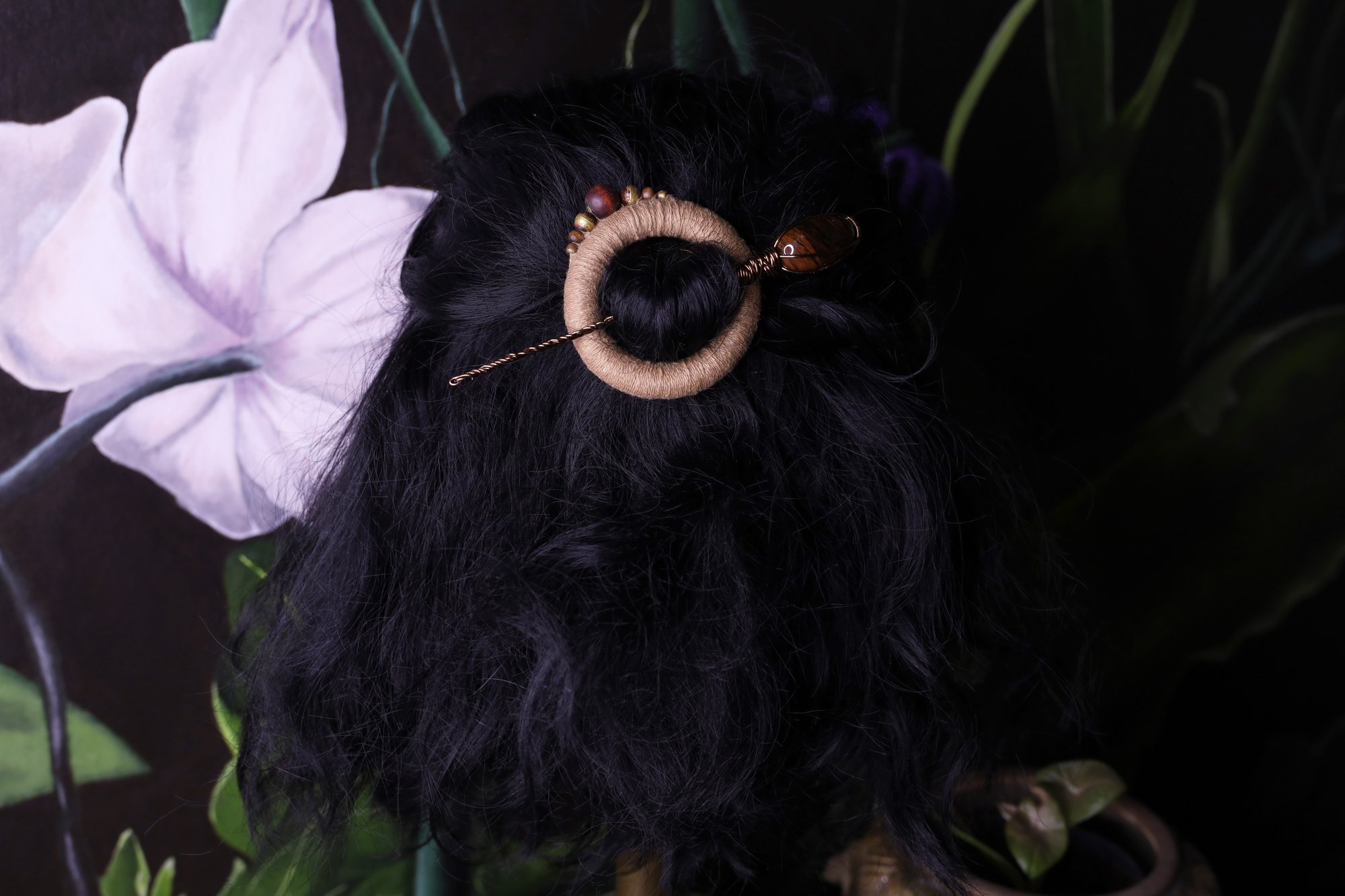For this more neutral piece, the ring is wrapped with beige hemp cord and it has a variety of wooden and metal beads on the outside. The hair pin has a stunning piece of mahogany obsidian wrapped with antique bronze copper wire.