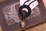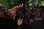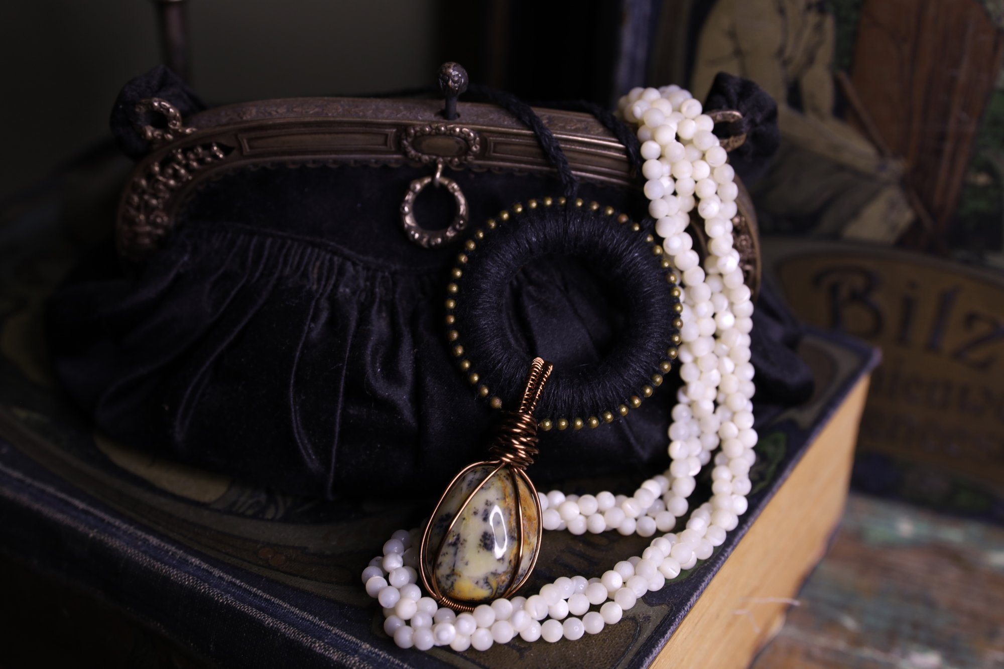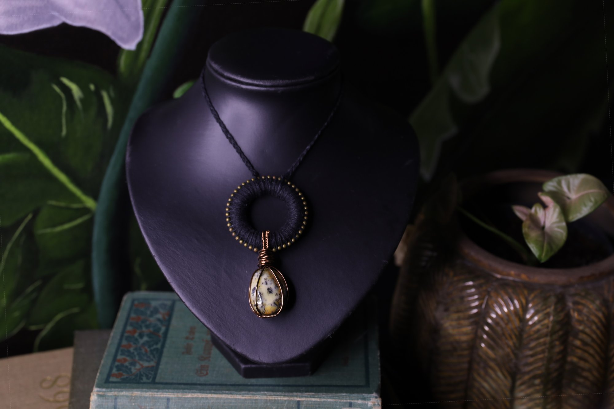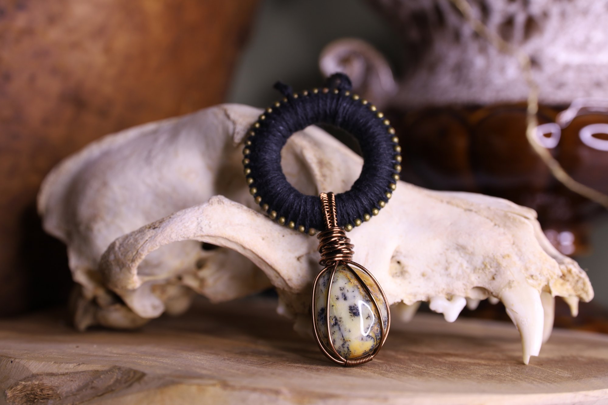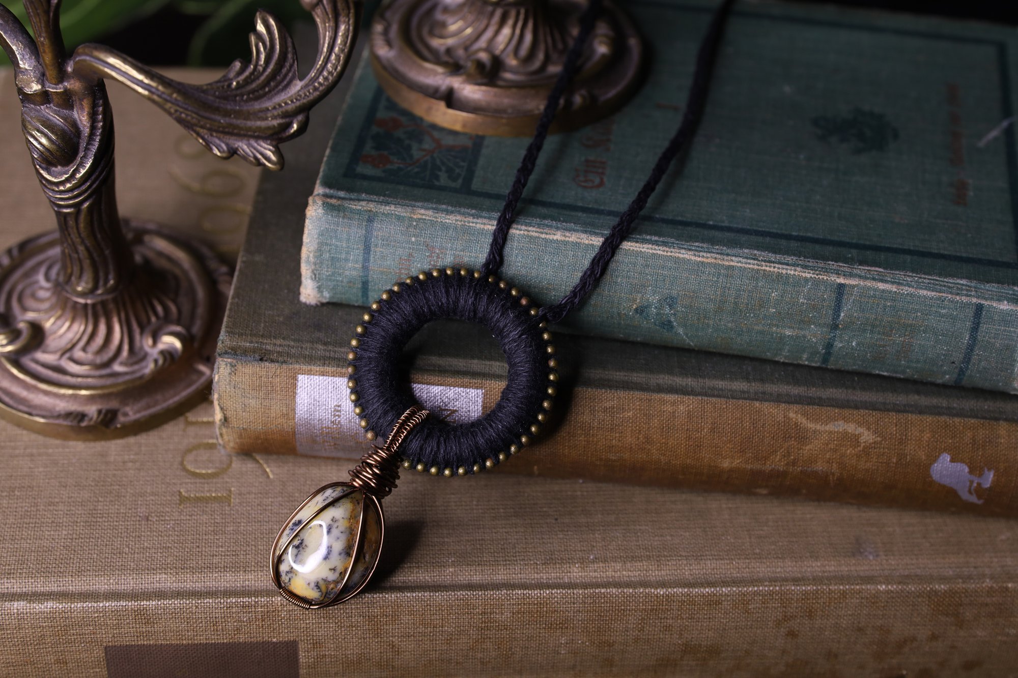 To make the stone stand out, the ring is wrapped with black hemp cord. This creates a nice contrast with the stone while also matching the black dendritic pattern. It’s wrapped in antique bronze copper wire and has matching metal beads along the outside of the ring.