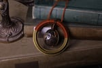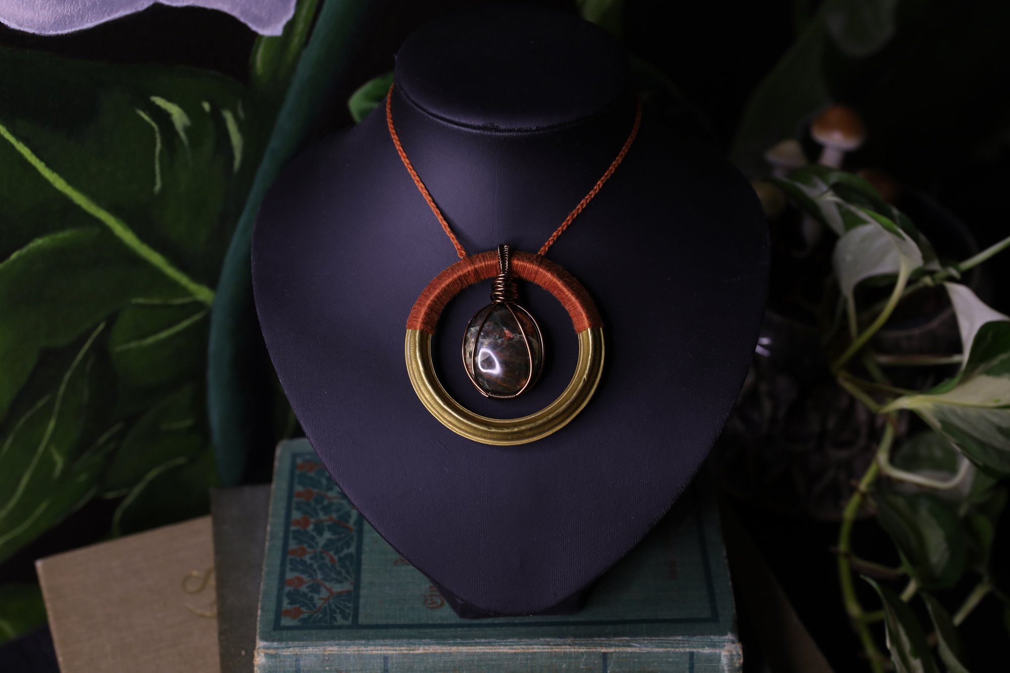 This necklace has a brass ring, partially wrapped with orange cotton yarn. Inside the ring is a beautiful piece of dark green flower agate mounted in antique bronze copper wire. The flower agate has small, orange speckles that are the same colour as the yarn.