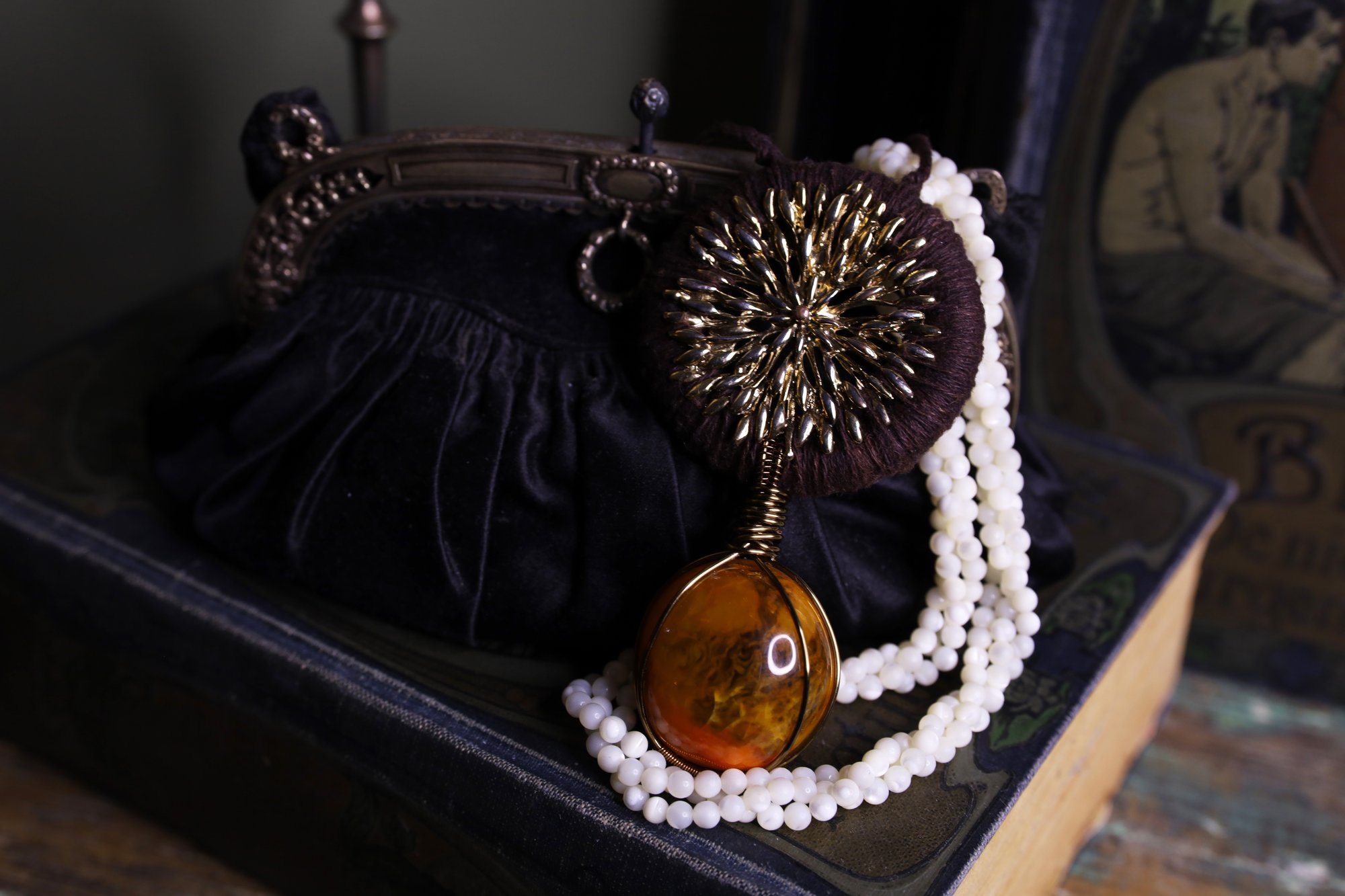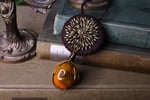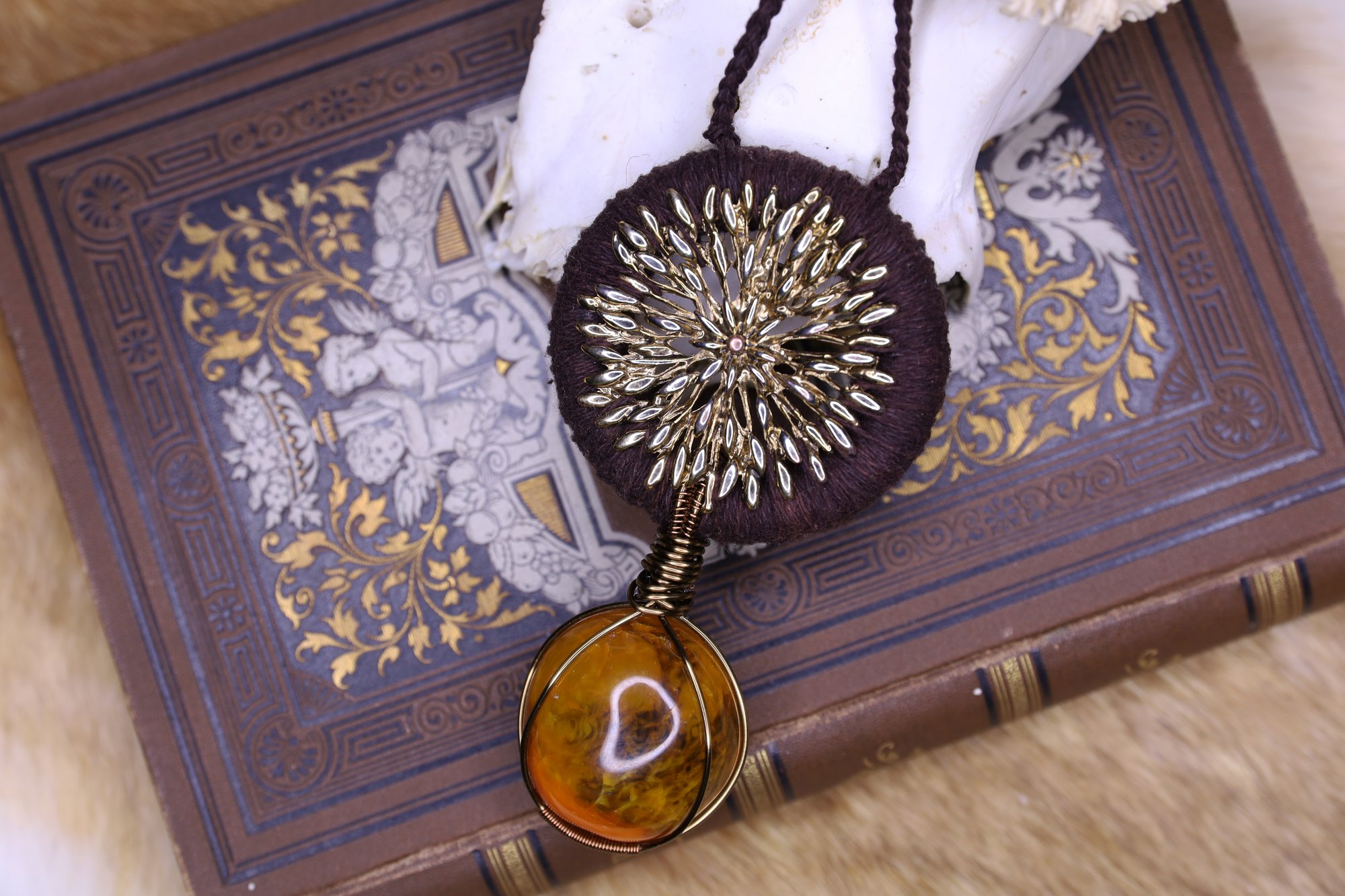 This necklace is a special piece, due to the unknown and relatively rare bloodmoon agate. The stone is set against a ring wrapped in dark brown hemp cord. This dark brown shade can also be found in the agate itself. It also compliments the orange colour of the bloodmoon agate perfectly. The stone is wrapped with antique bronze copper wire. A golden coloured ornament is place in the middle of the ring, which looks like sunrays.