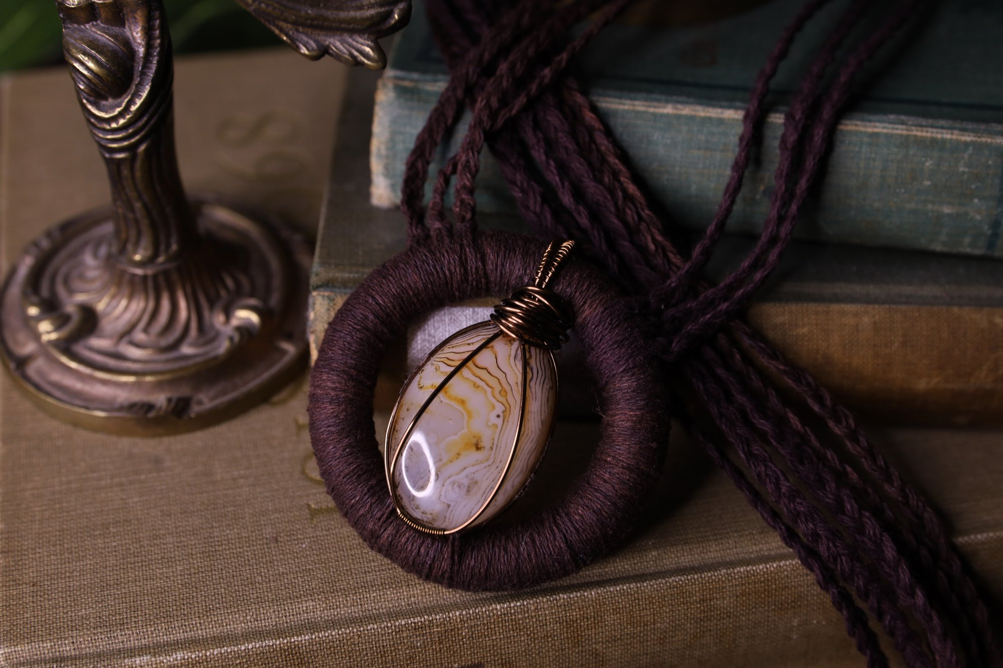 With a gorgeous piece of silk agate at it's center, this belt has a neutral, but elegant feel. The stone is mounted with antique bronze copper wire inside a ring wrapped in dark brown hemp cord. On each side of the ring are 3 braids of approximately 140cm long.