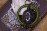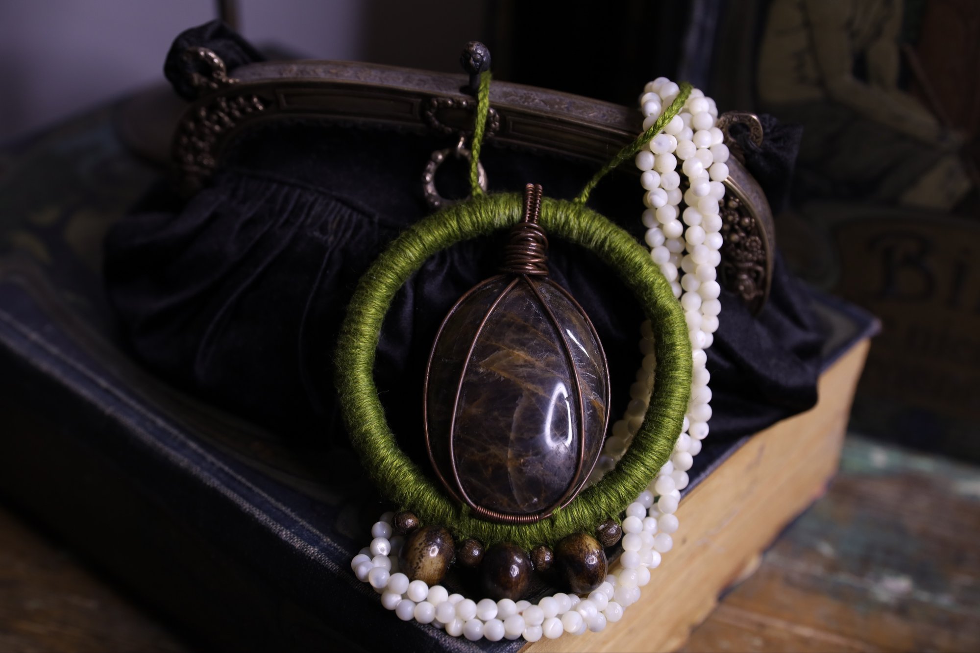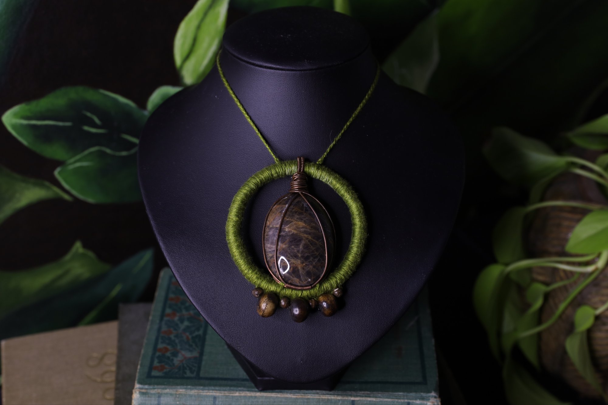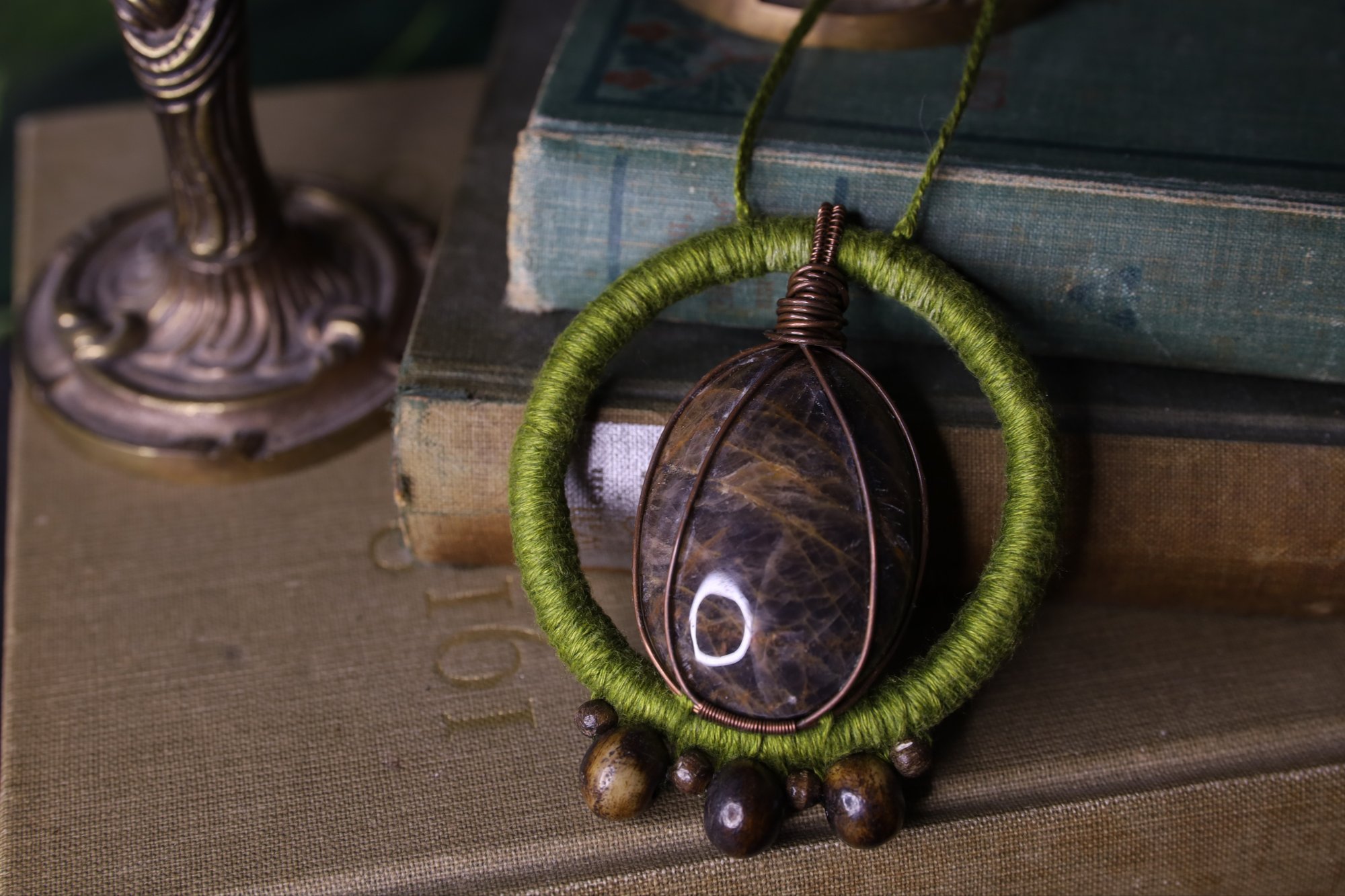 The black moonstone in this necklace definitely is an eye-catcher, with the gorgeous brown pattern it has throughout the stone. The brighter green linen that's wrapped around the ring makes the stone pop even more. To make sure the copper wire wouldn't distract from the moonstone, it's wrapped in patinated copper wire. The wooden beads on the bottom of the ring have similar colours as the moonstone and make for a nice finishing touch.