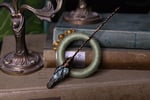 This hair pin consists of a pin made from antique bronze copper wire with a stunning piece of half polished labradorite. The labradorite has a beautiful flash in the raw side, but also in the polished side. The pin is combined with a ring wrapped in light green linen. The ring has small, wooden beads along the outside.