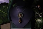 This desaturated green necklace has a ring wrapped with linen yarn as it′s base. Inside the ring is a stunning ornament set, with lovely details. Mounted from the ring in antique bronze copper wire is a beautiful piece of tiger eye, which matches perfectly with the ornament.