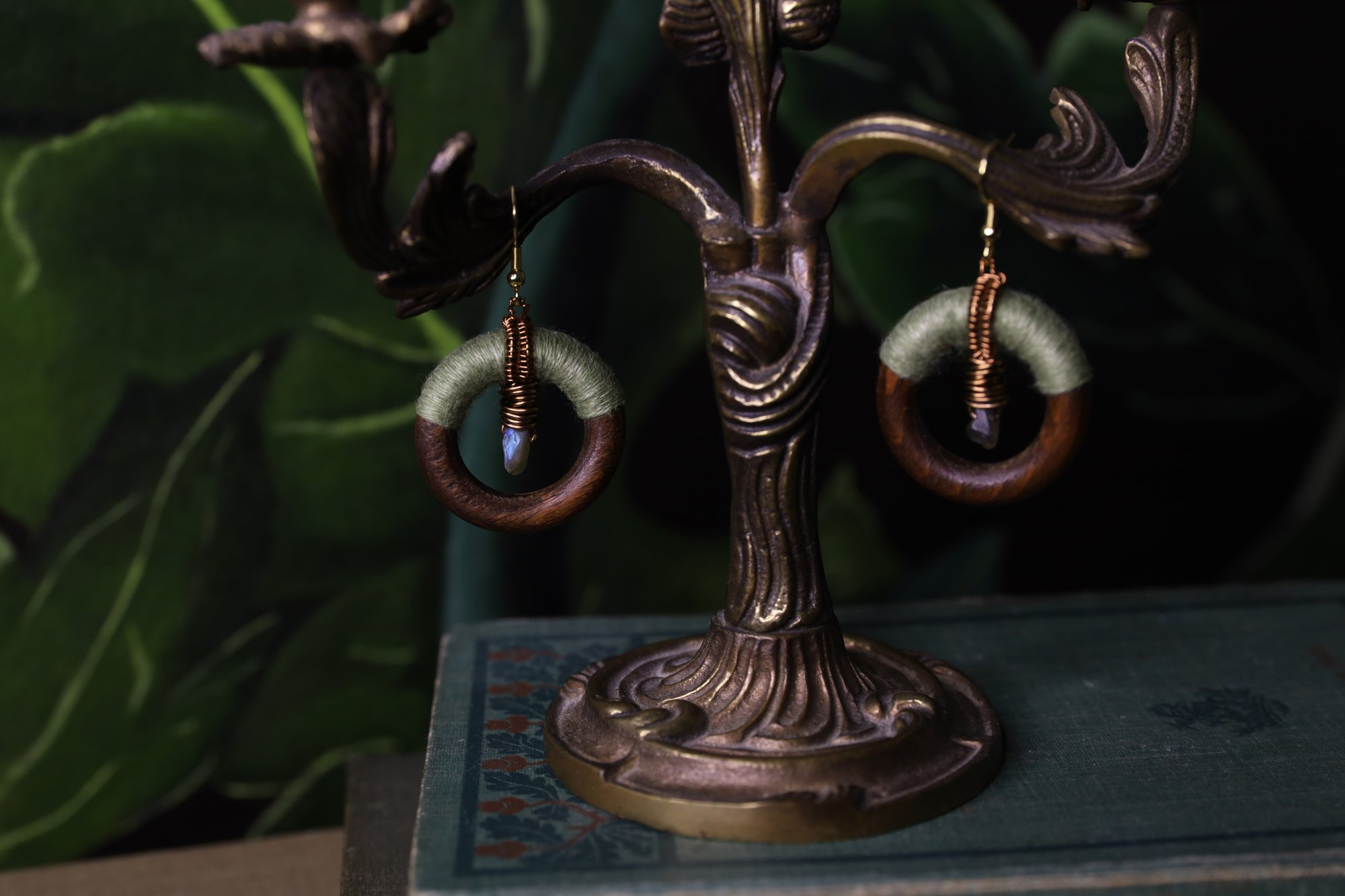 The rings are partially wrapped with light green linen. Inside the rings are tiny pieces of labradorite. The stones are wrapped with antique bronze copper wire.
