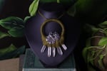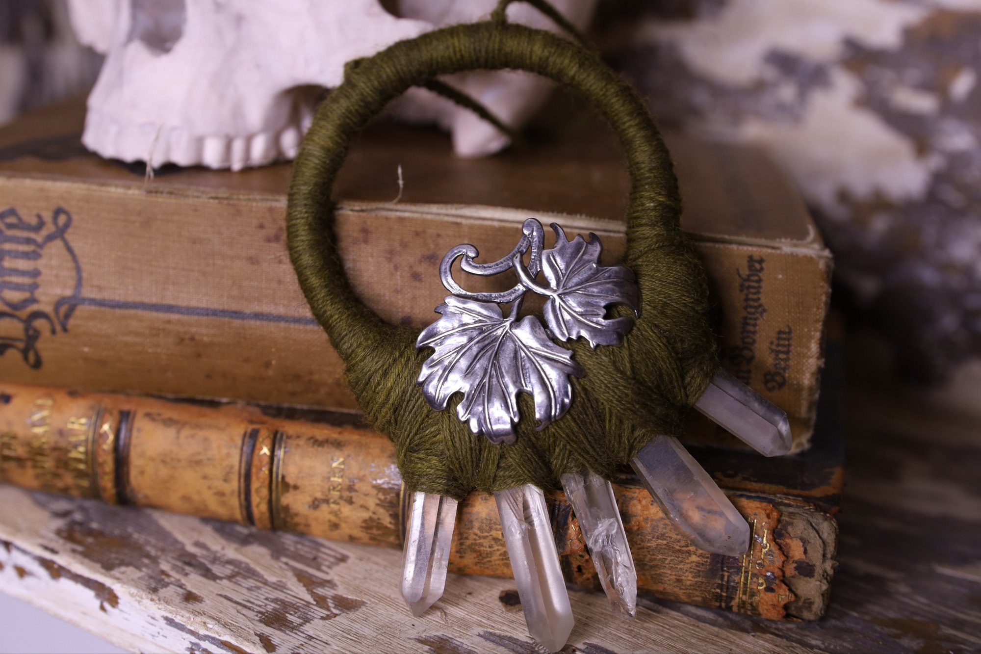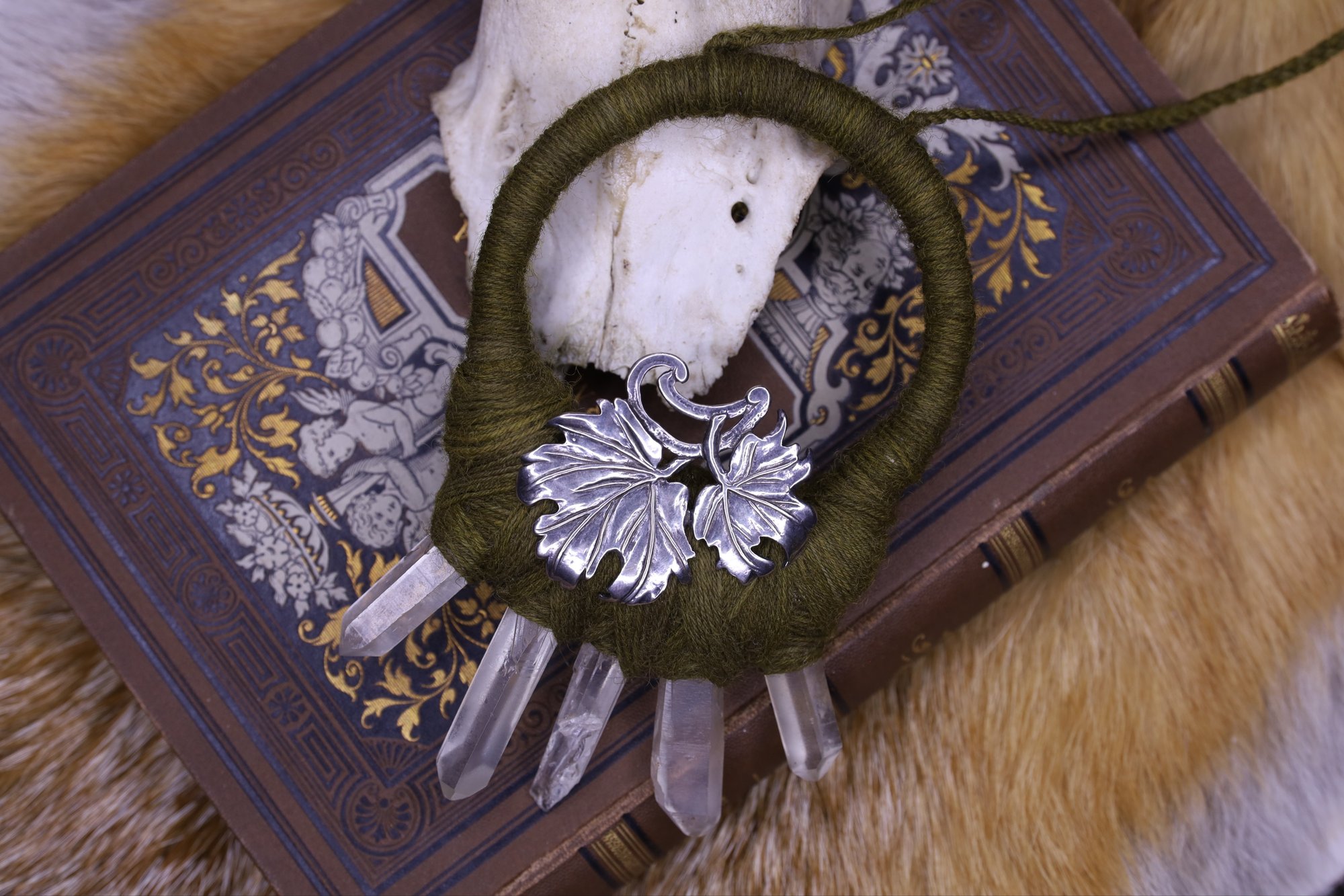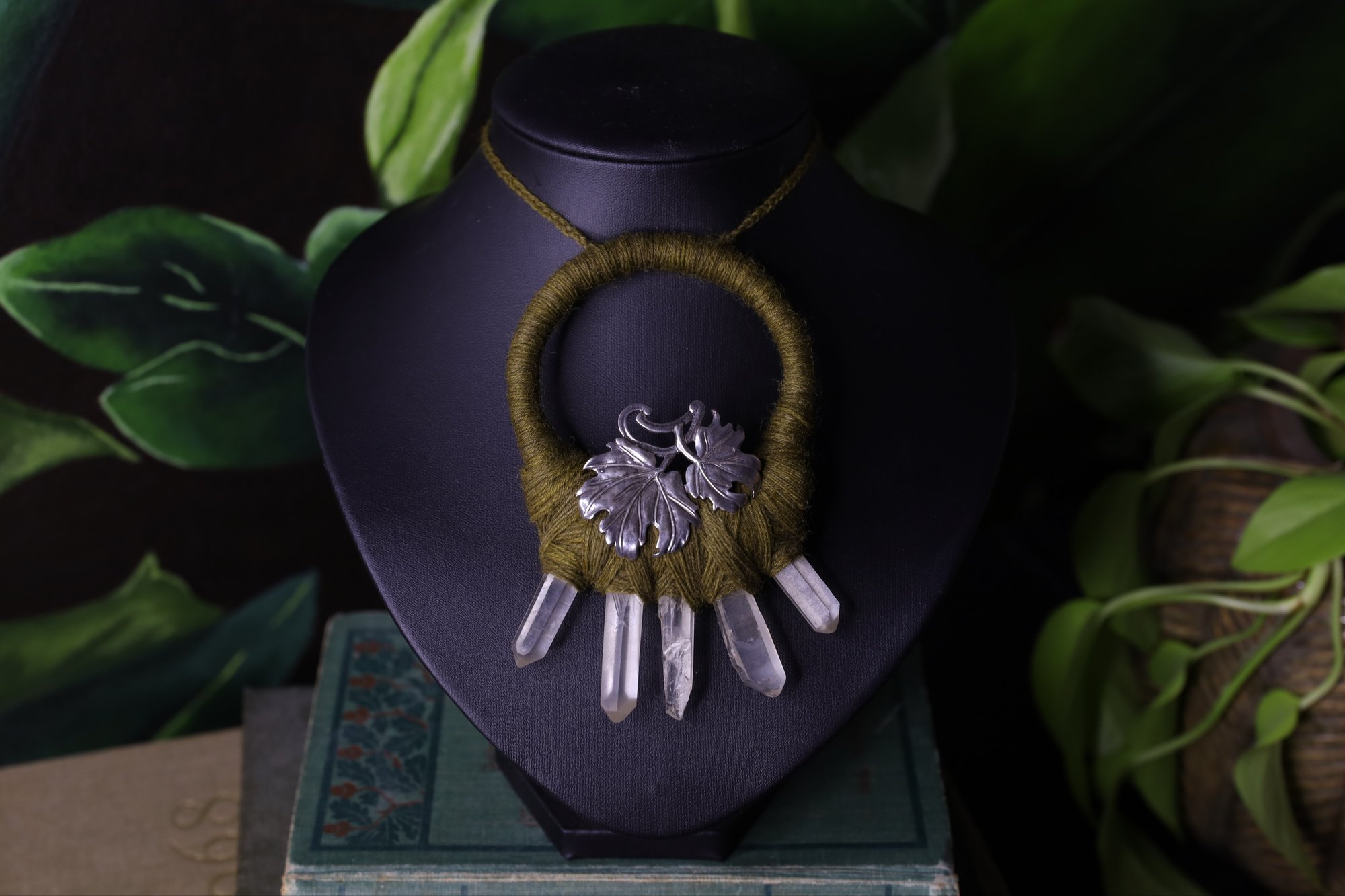 This necklace has a more experimental design. Instead of having a stone or crystal wrapped in copper wire, it has 5 pieces of clear quarts around the bottom. The ring and base of the quartz pieces are wrapped in a beautiful green wool, which is hand dyed. It also has a leaf shaped ornament, which gives it an elegant and elvish look.