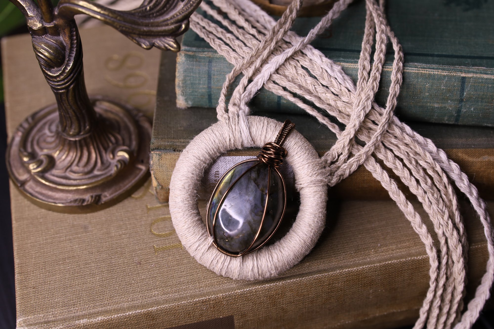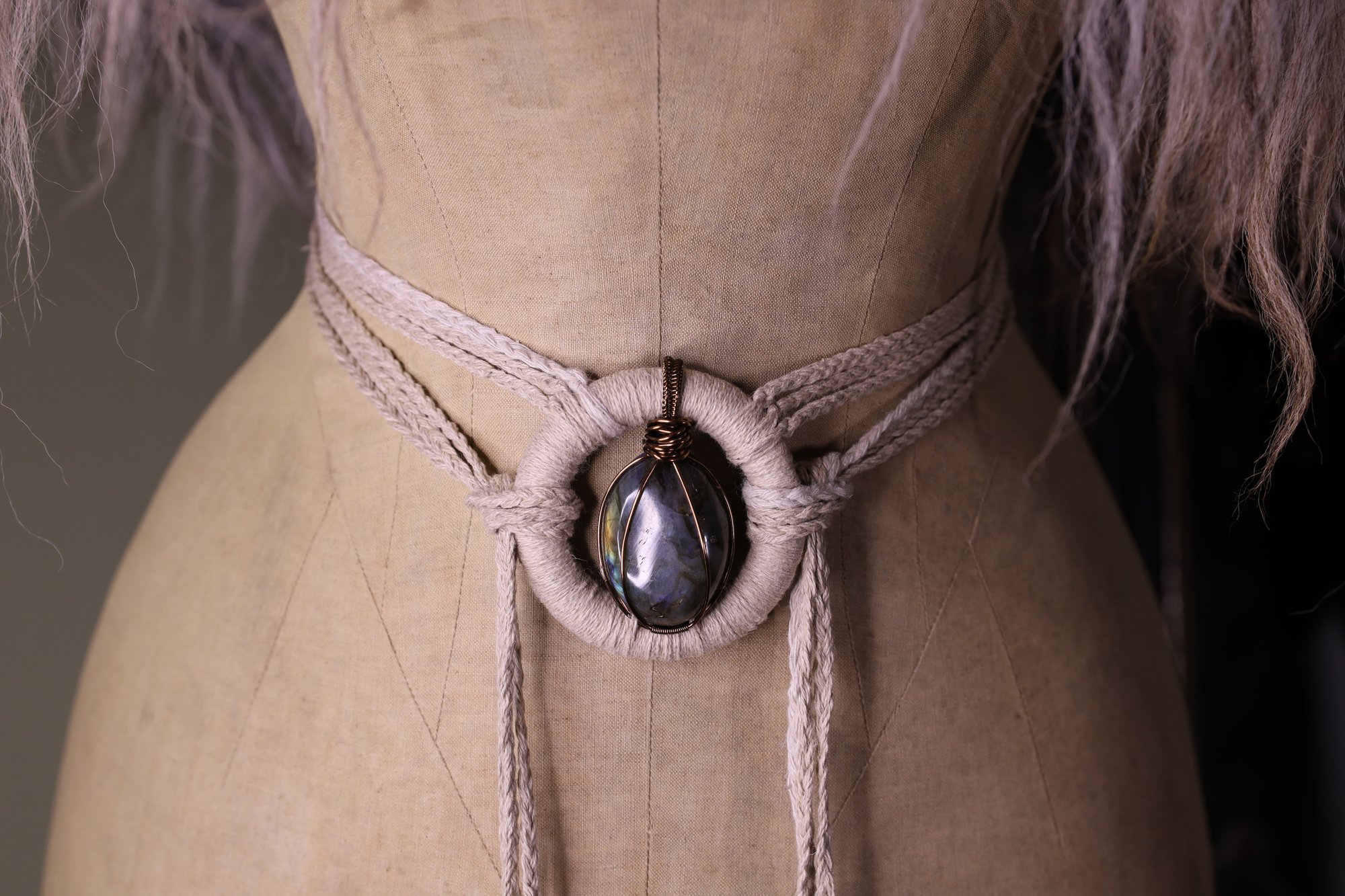 This light coloured belt has a ring wrapped in natural hemp cord. Mounted in antique bronze copper wire is a beautiful piece of labradorite.