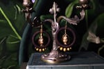 These rings are wrapped with thrifted, orange cotton yarn. The colour of the cotton match the orange specks in the unakite really well. The pieces of unakite are wrapped with antique bronze copper wire. Along the outside of the rings are small metal beads in a similar colour as the copper wire.