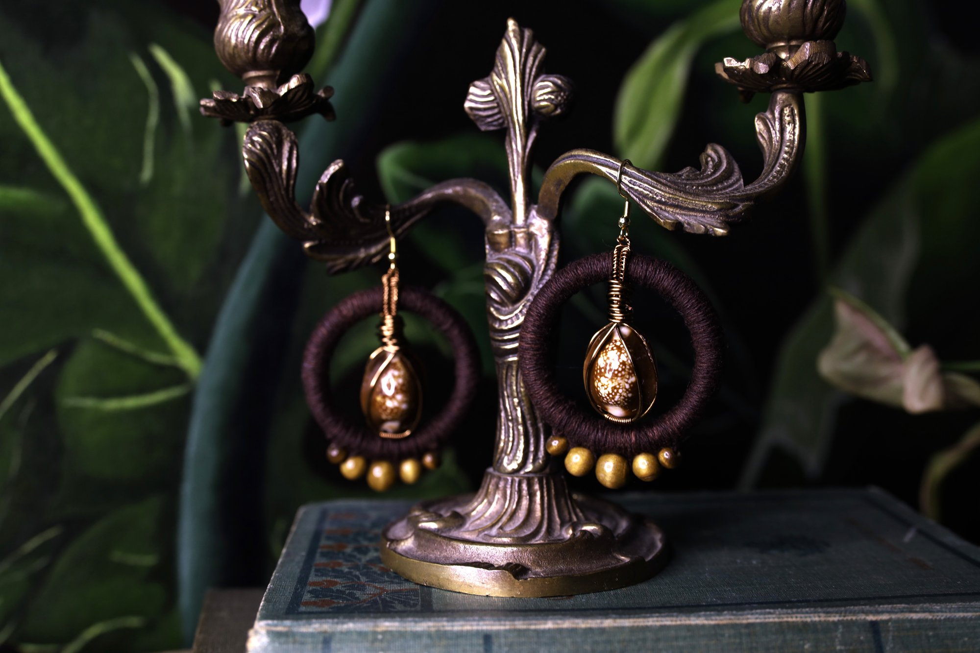 The colours and pattern in these cowry shells make these earrings stand out. The dark brown hemp cord and antique bronze copper wire match perfectly with the shells. The wooden beads along the bottom of the earrings repeat the lighter brown shade of the shells nicely.
