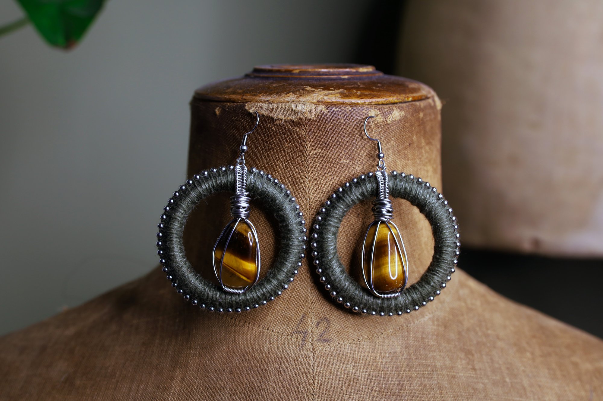 The rings are wrapped with a greyish green linen. The earrings feature beautiful pieces of tiger eye wrapped in tin coated copper wire. Along the outside of the rings are small metal beads in a silver colour.