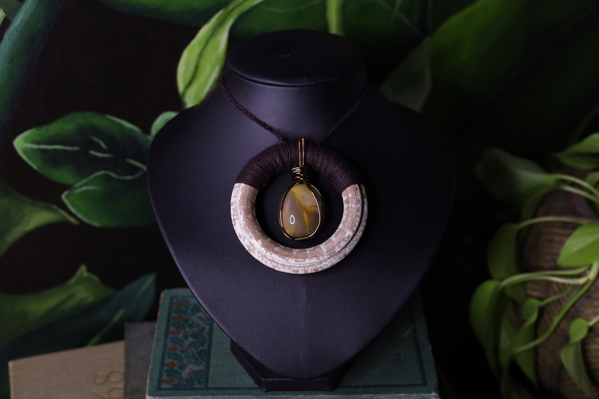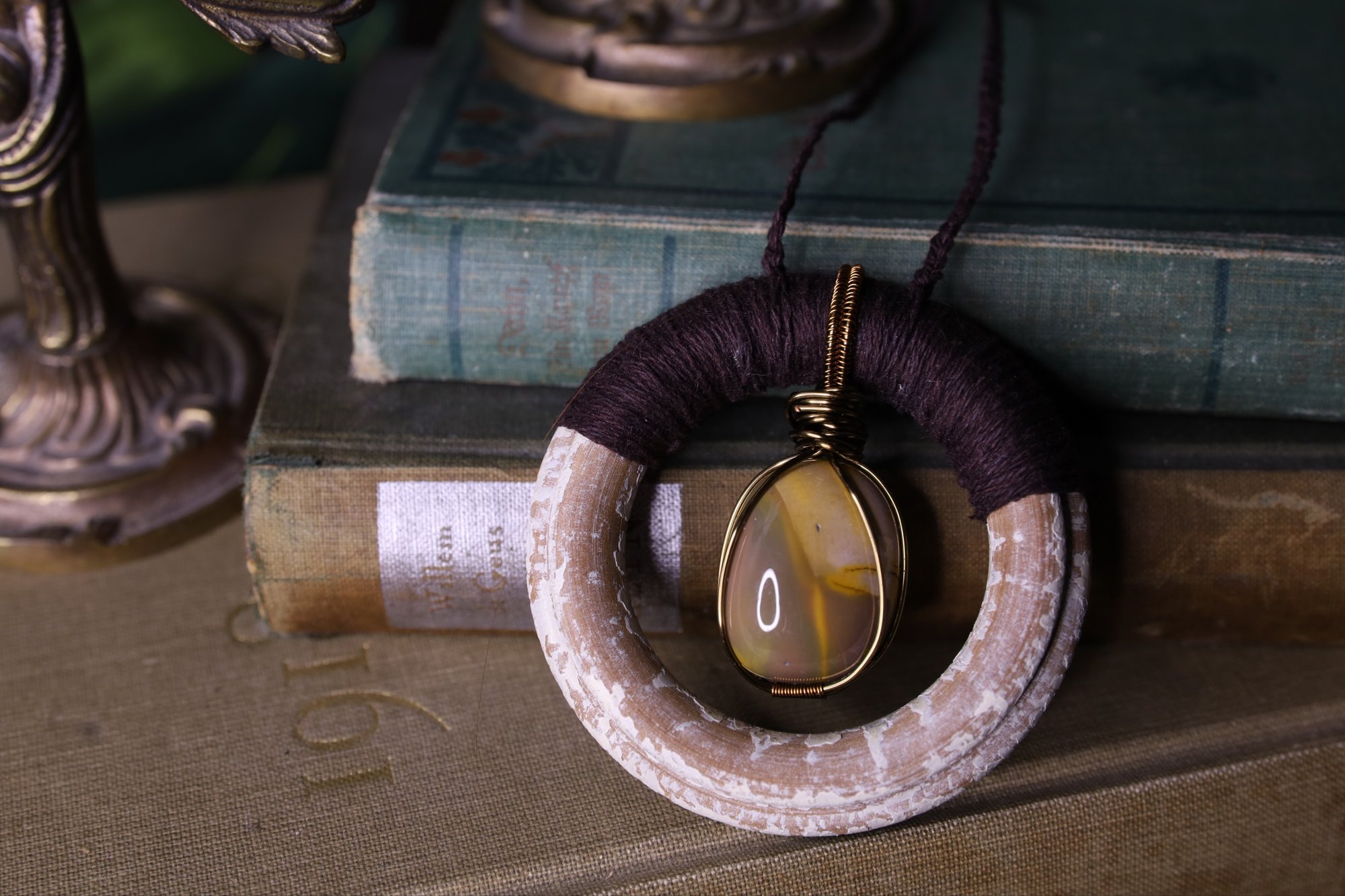 This design is a variation on the usual wrapped ring designs. The base is a thrifted wooden ring, which is only partially wrapped to show the texture of the wood and paint on the ring itself. Set inside the ring is a beautiful piece of mookaite, with shades of yellow, grey and off-white. To balance the colours nicely, the yarn used for the wrapping is a dark brown hemp cord and the stone is wrapped in antique bronze coloured copper wire.